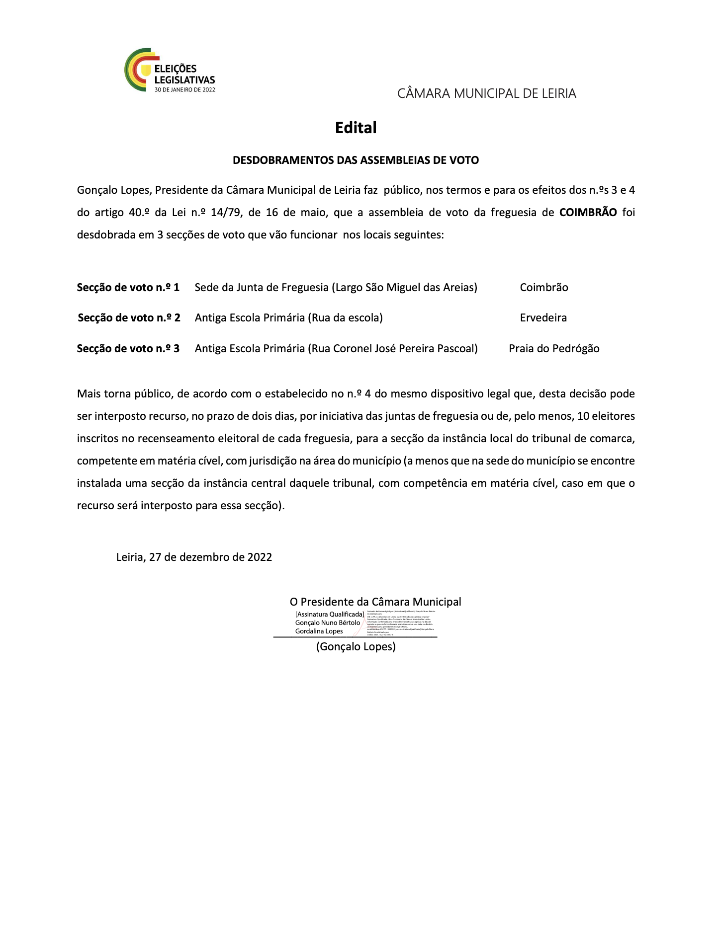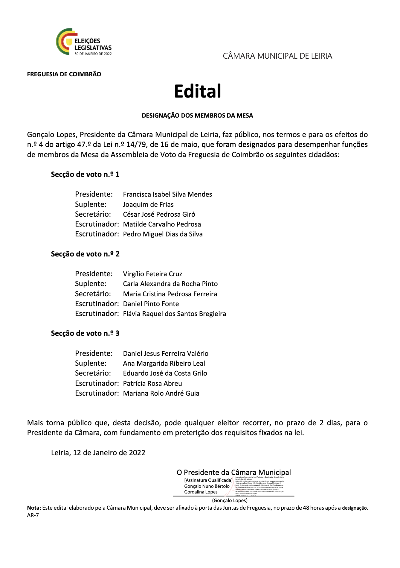 Eleições Legislativas - Edital designação dos Membros da Mesa