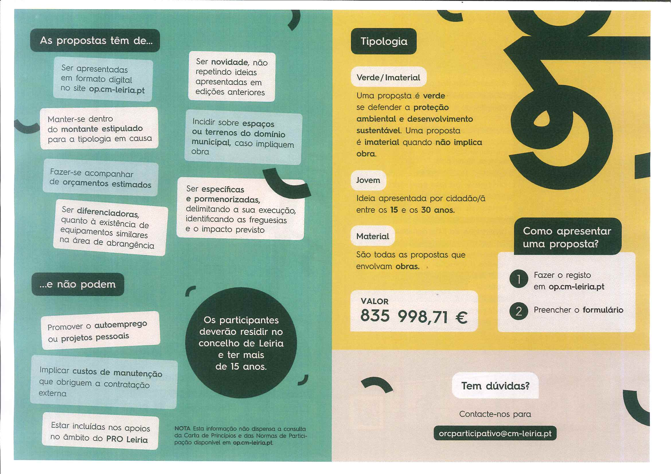 O Orçamento Participativo tem como objetivos promover a participação informada, ativa e construtiva dos cidadãos e incentivar o diálogo entre os munícipes e os eleitos locais, bem como adequar as políticas públicas municipais às necessidades e expectativas da população.