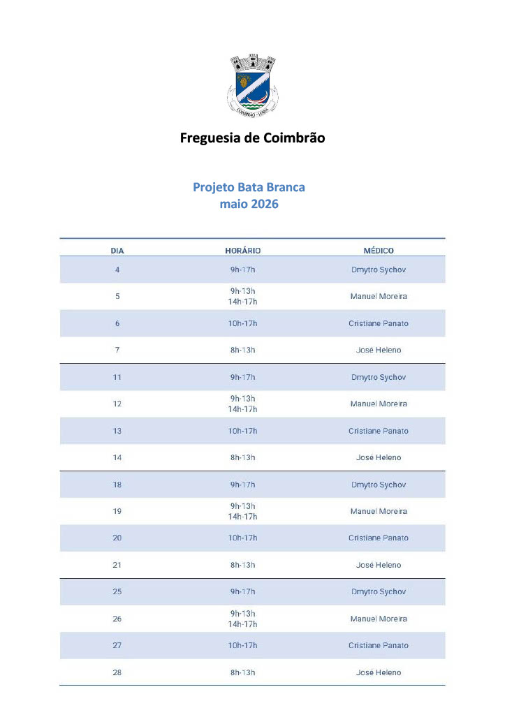 | Quarta-feira | 09:00 - 12:30 | 14:00 - 16:30 | 19:00 - 20:00 |